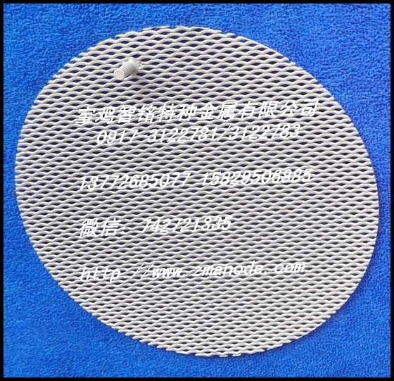 牌号:TA1 TA2 规格:标准规格或根据用户特殊要求设计生产 特性:低过电位,耐腐蚀,寿命长,安装维护简便 工艺:热分解 结构:钛基+活性催化剂 用途:MMO,阴极保护,电镀,电解,电冶金,有机合成,电渗析,电解水,有机废水降解等领域 宝鸡智铭特种金属有限公司专业从事钛阳极,钛电极,涂层钛电极,钌钛电极,钌铱钛电极,钌铱锡钛电极,铱钽钛电极,铱铂钛电极,铂电极,铂金钛网,白金钛网,二氧化铅钛电极等系列产品,品质优良,价格合理,交货及时,欢迎各界朋友来电咨询洽谈; 销售部:0917-3122781 0917-3122783 0917-3122785 联系人:赵经理 高经理 田经理 主页http://www.zmanode.com email:1550319555@qq.com