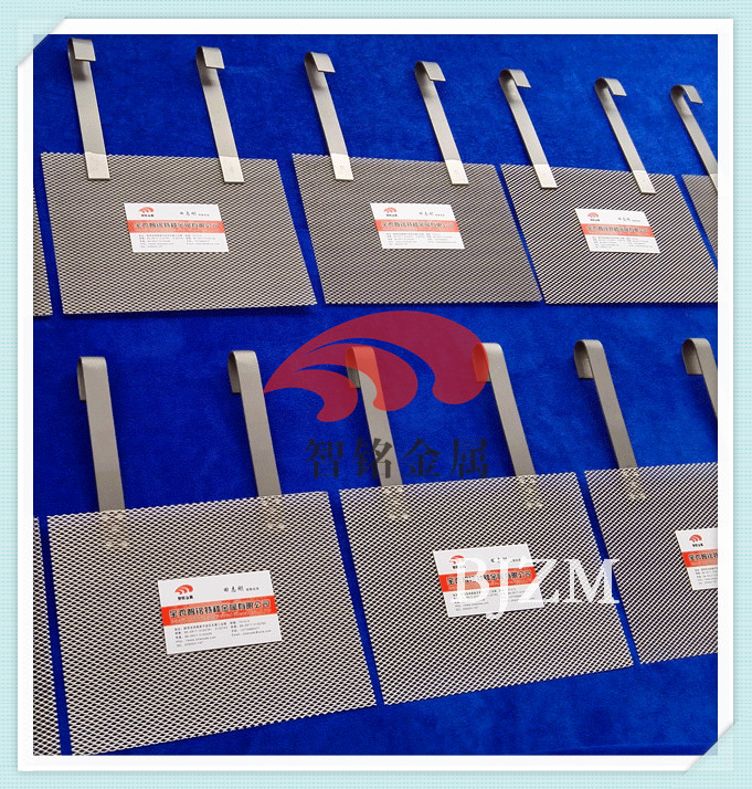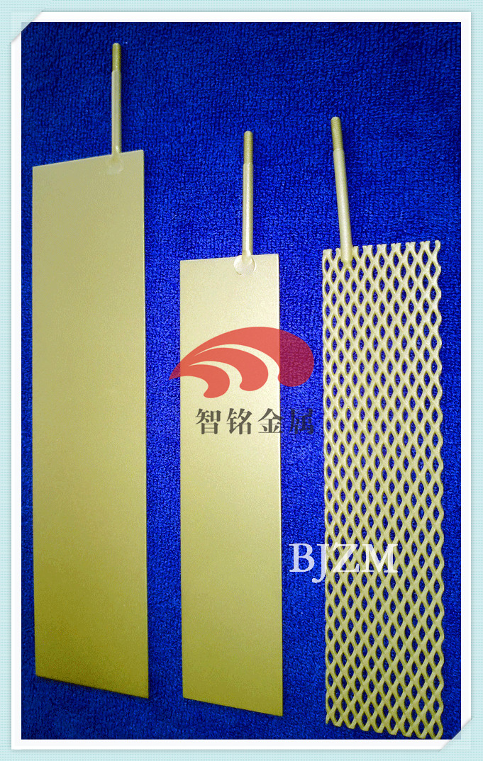 6、钛电极工作中对介质不会产生二次污染 【钛阳极 钛电极 使用参数】 1、适用PH值:0.1—14 2、运行电流密度:< 2000-5000A/m2 3、电极类型:析氧型电极和析氯型电极 4、基材选用优质工业纯钛,牌号TA1 【钛阳极 钛电极应用领域】 1、有色金属生产和回收,电沉积生产铜、镍、钴电解生产高纯金属;宝鸡智铭特种金属有限公司生产的钛电极板成功用于于电积镍、铜、钴等领域; 2、电镀贵金属电镀(金、银、铑、铂和钌) 表面化学镀铜、镍、锌、电镀铬,印制电路板化学电镀,点镀刷镀等领域; 3、金属回收电镀液废水处理; 4、电化学有机合成、电解海水、海水淡化、过硫酸盐制取、氧化剂再生、放射性污染物处理; 5、桥梁阴极保护、输油管道的阴极保护、热交换器阴极保护、滨海钢结构建筑、输水管道和海水泵阀,海洋设施及船体等阴极保护。 6、有机废水,氨氮废水,焦化废水,冷却循环水,垃圾渗滤液电催化降解等; 【钛阳极 钛电极产品优越性】